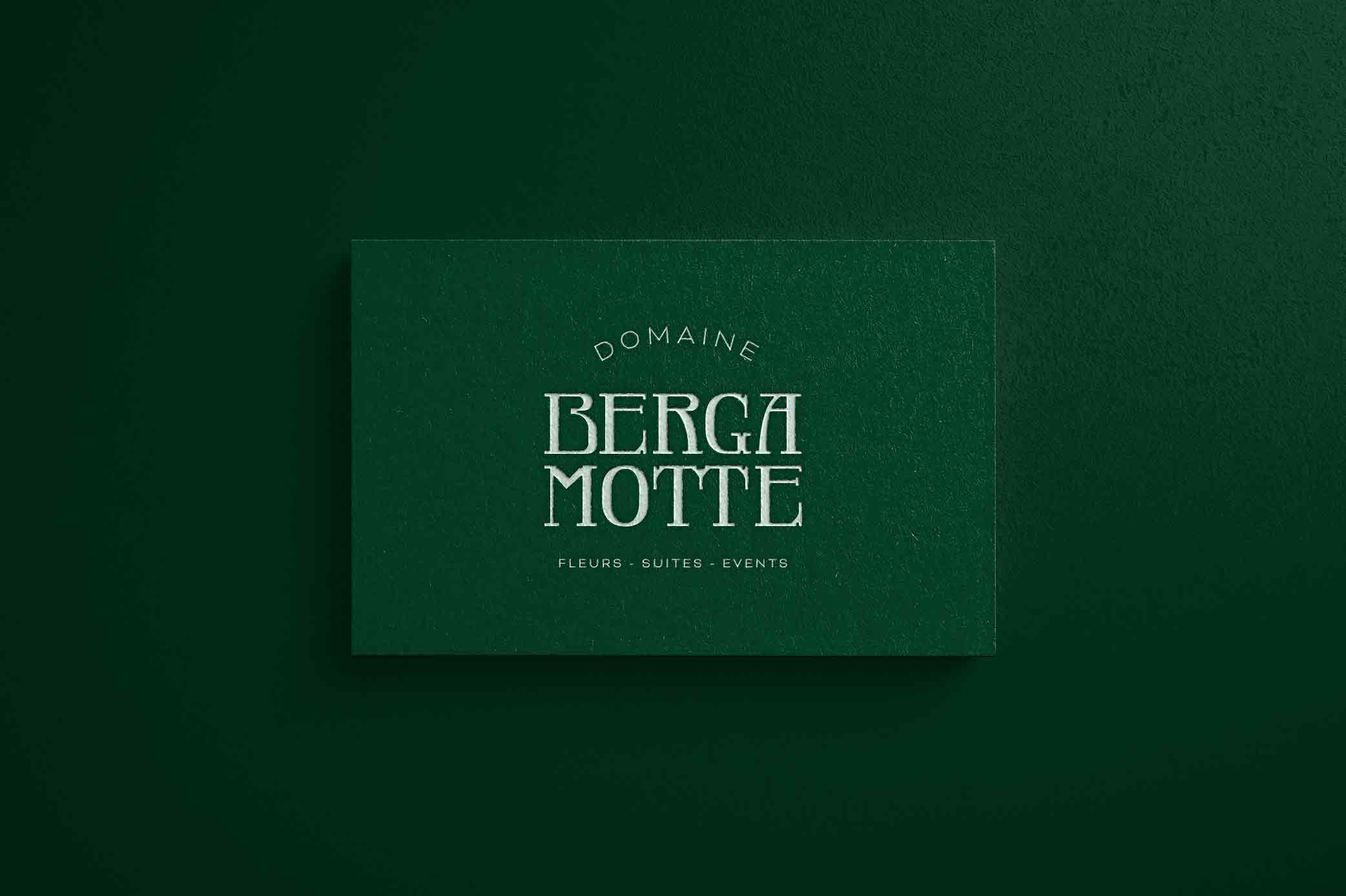 Le Domaine Bergamotte est un ancien domaine que ses propriétaires souhaitent faire revivre à travers un projet mêlant plusieurs activités : un flower shop, des suites et une cuvée. L’enjeu de l’identité visuelle était de réunir ces univers au sein d’un langage graphique cohérent, tout en restant fidèle à l’histoire et au caractère du lieu. La typographie du logo a été entièrement dessiné sur mesure afin d’exprimer la rencontre entre l’architecture du domaine et le monde végétal. Sa typographie s’inspire à la fois de structures observées dans des carnets de broderie et des lignes de l’Art nouveau, mêlant rigueur et organicité. La lecture en deux temps — Berga / Motte — fait écho à l’histoire du lieu et au jeu de mot avec la motte, terme néerlandais désignant la butte sur laquelle se trouve une tour classée au centre du domaine. L’identité graphique s’appuie également sur les arches présentes dans la cour du domaine, devenues un élément structurant des compositions. Ce vocabulaire architectural est complété par des tiges organiques, inspirées du mouvement des compositions florales, qui apportent une dimension vivante et sensible à l’ensemble. La palette chromatique repose sur trois teintes complémentaires, dont un vert profond directement issu des châssis du bâtiment, qui constitue la couleur principale du domaine. L’ensemble forme une identité élégante et contemporaine, profondément ancrée dans le lieu et pensée pour vivre aussi bien sur les supports imprimés que dans les communications digitales du domaine.